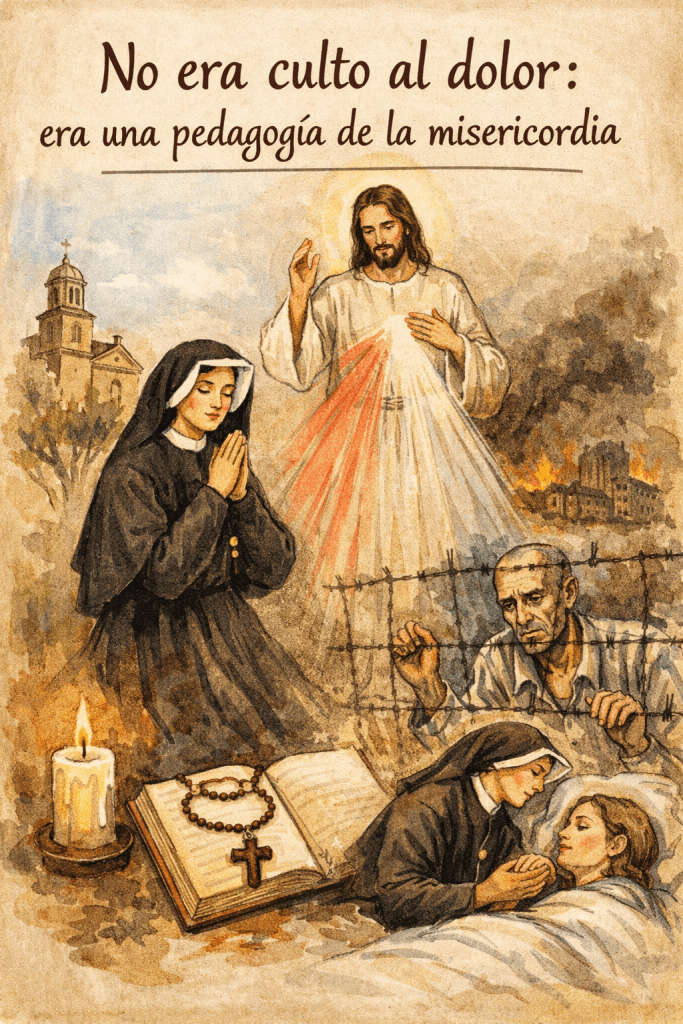 Más adelante llega el cuerpo. La enfermedad. La tuberculosis. El agotamiento. Pero es importante notar algo que el Diario deja claro: Faustina no busca el dolor. No lo fabrica. No lo glorifica. Vive en una época en la que todavía circulan prácticas de sacrificio físico extremo, y sin embargo ella va comprendiendo —poco a poco— que una oración dicha con verdad, un trabajo ofrecido con amor, una atención concreta al otro, valen infinitamente más que cualquier castigo corporal autoimpuesto. Hay un desplazamiento silencioso pero decisivo: del dolor buscado al dolor inevitable, y de ahí a la misericordia.