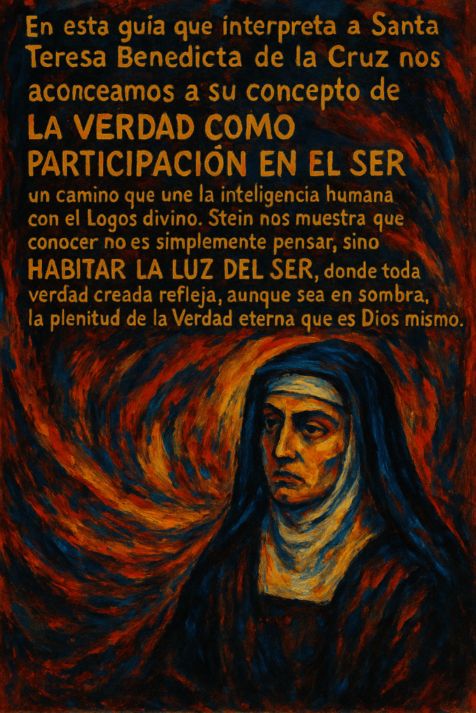 VII. Conclusión: habitar la verdad En la síntesis de Edith Stein, la verdad no es una fórmula lógica, sino un modo de ser. Ser verdadero es existir en relación con el Logos. Toda criatura participa de la Verdad en la medida en que participa del Ser. El impulso de conocer no es mera curiosidad: es nostalgia del origen. Por eso el alma que conoce con amor participa en el mismo acto por el cual Dios conoce y ama al mundo. La verdad no se posee: se habita. Y en esa morada se cumple la palabra definitiva del Logos: “Yo soy la Verdad.”